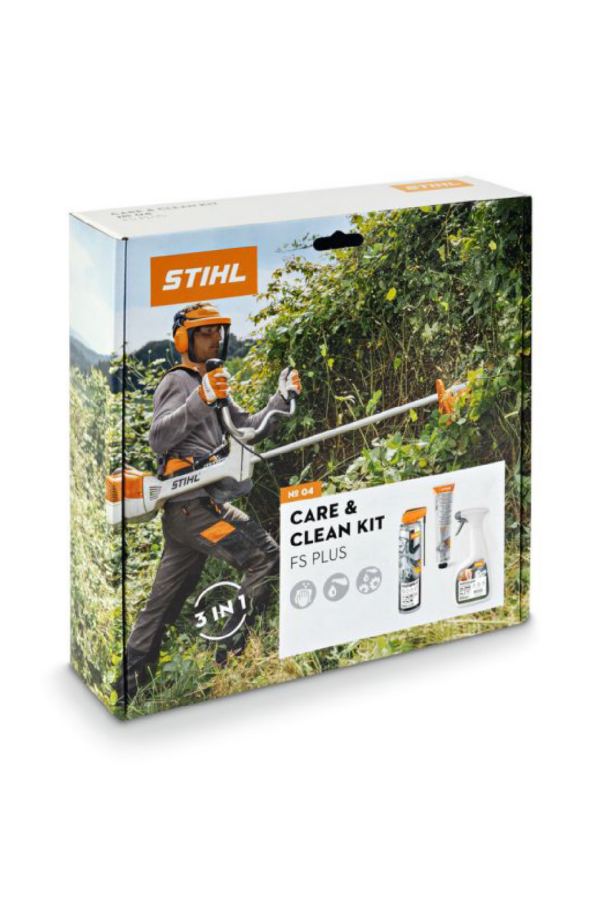 Care & Clean Kit FS PLUS Stihl : nettoyez, lubrifiez et protégez vos débroussailleuses avec Multispray, Superlub FS et Varioclean.