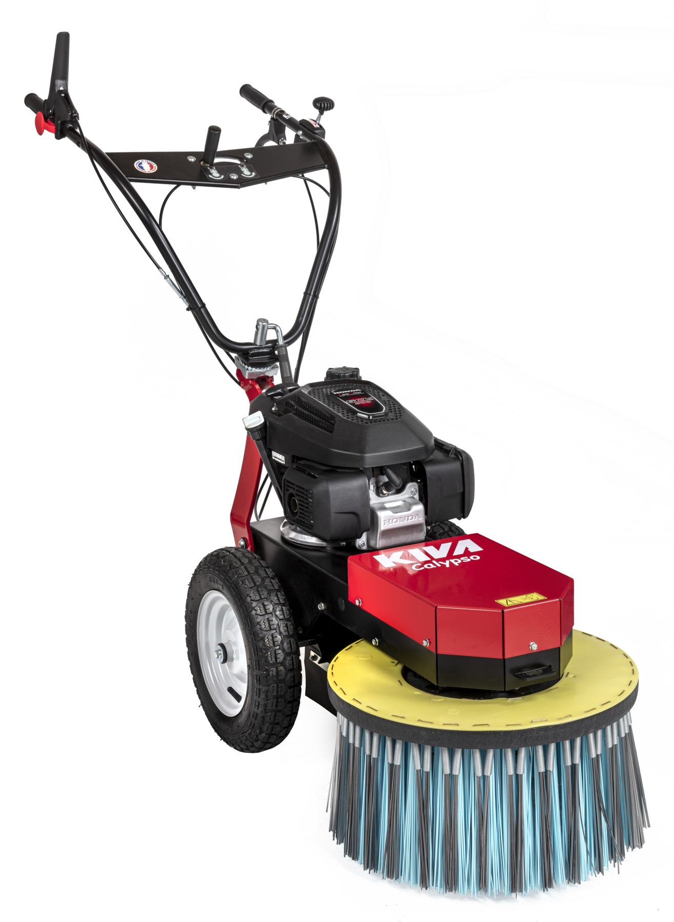 Désherbeuse Kiva Calypso équipée de brosses métalliques pour le nettoyage sécurisé des chaussées, trottoirs et surfaces dures.
