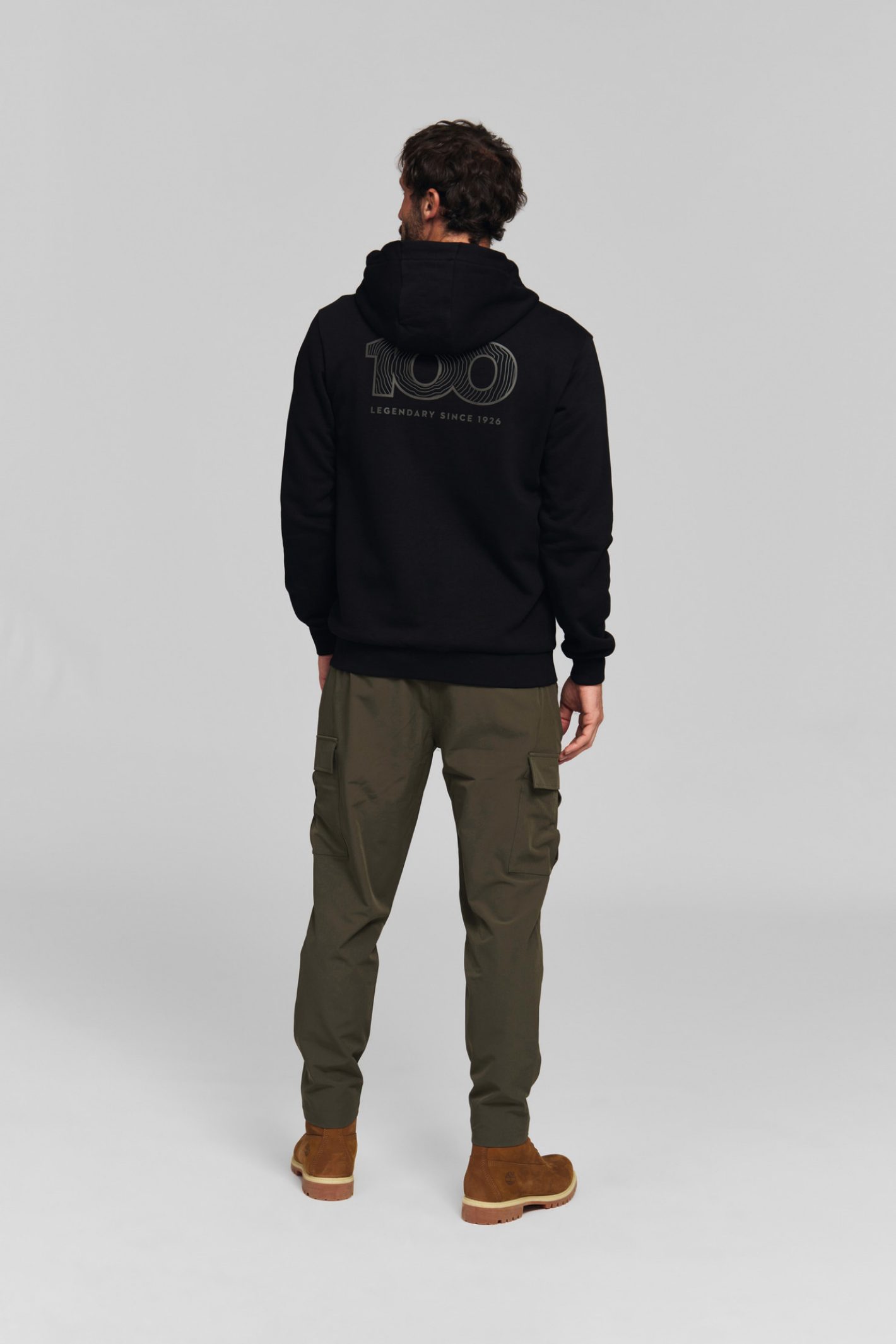 Veste à capuche STIHL Édition Collector 100 ans en coton bio, unisexe, noire, logo poitrine et imprimé réfléchissant au dos.