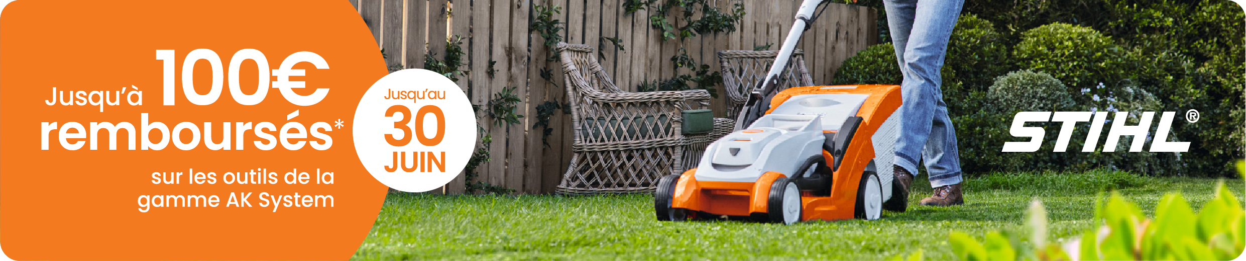 Du 2 mars au 30 juin 2026, des offres de remboursement de 30 à 100 € sont proposées sur certains outils à batterie de la gamme AK SYSTEM. Offre valable pour tout achat auprès d’un revendeur agréé STIHL en France métropolitaine ou sur stihl.fr dans la limite de 20 000 participations (hors tonte) et 8 000 pour les tondeuses. Une seule participation par foyer et par offre est autorisée.